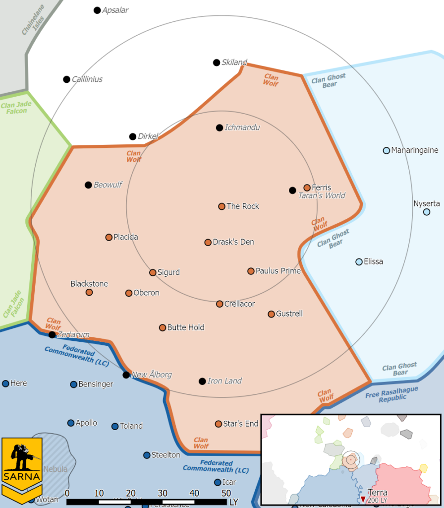 Para a sua missão em The Rock, isso importa muito. Naquele momento, os guerreiros da Esfera Interior ainda não entendiam o que estavam enfrentando. Para eles, o Clã Wolf parecia quase impossível: máquinas mais rápidas, armas mais letais, pilotos mais disciplinados e uma postura de combate que misturava frieza, técnica e confiança absoluta. Não por acaso, quando a Invasão dos Clãs começou de vez em 3050, Clan Wolf foi um dos quatro Clãs da primeira onda e acabou conquistando mais mundos do que qualquer outro Clã invasor naquele início de campanha.